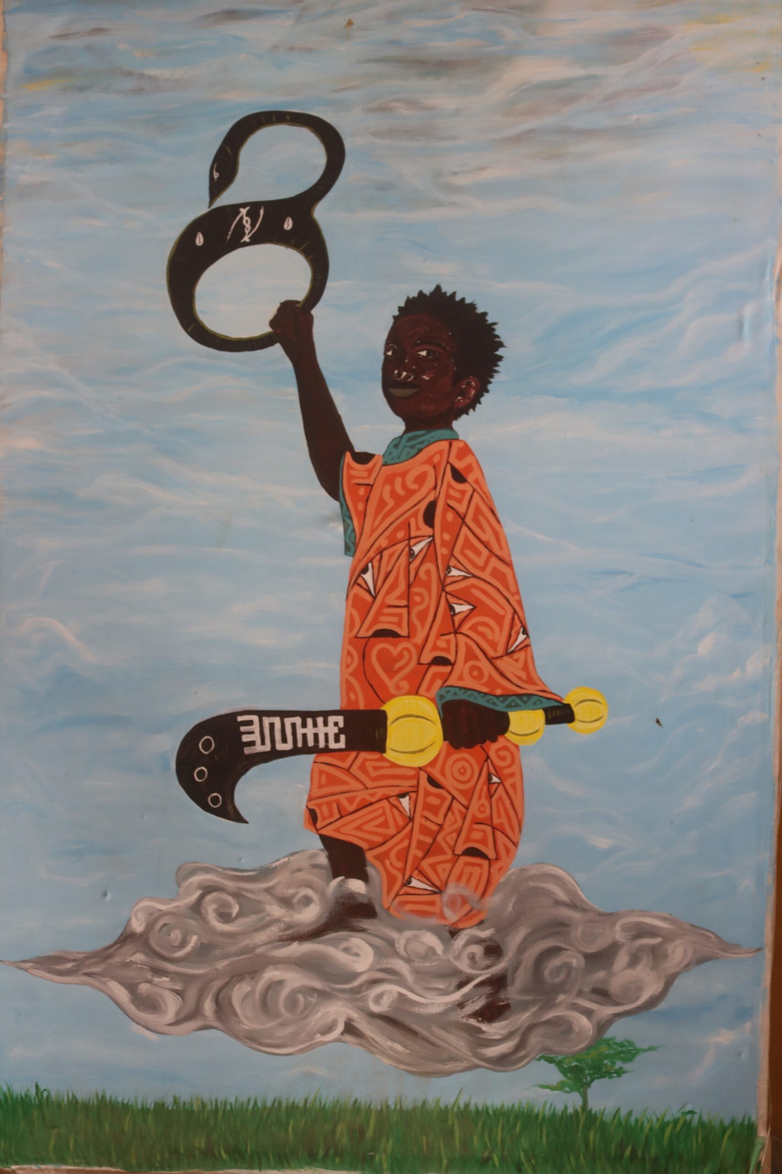 Immerse yourself in the vibrant world of traditional ethnic art with this stunning painting. The artwork showcases a mesmerizing figure adorned in cultural attire, holding symbolic elements that carry profound meanings. Against a backdrop of organic shapes and natural elements, the painting bursts with intricate patterns and vivid colors that captivate the eye. Measuring [insert size], this unique piece is a perfect addition to any art collection or home decor. A testament to cultural heritage and artistic craftsmanship, it is sure to be a conversation starter and a cherished treasure.