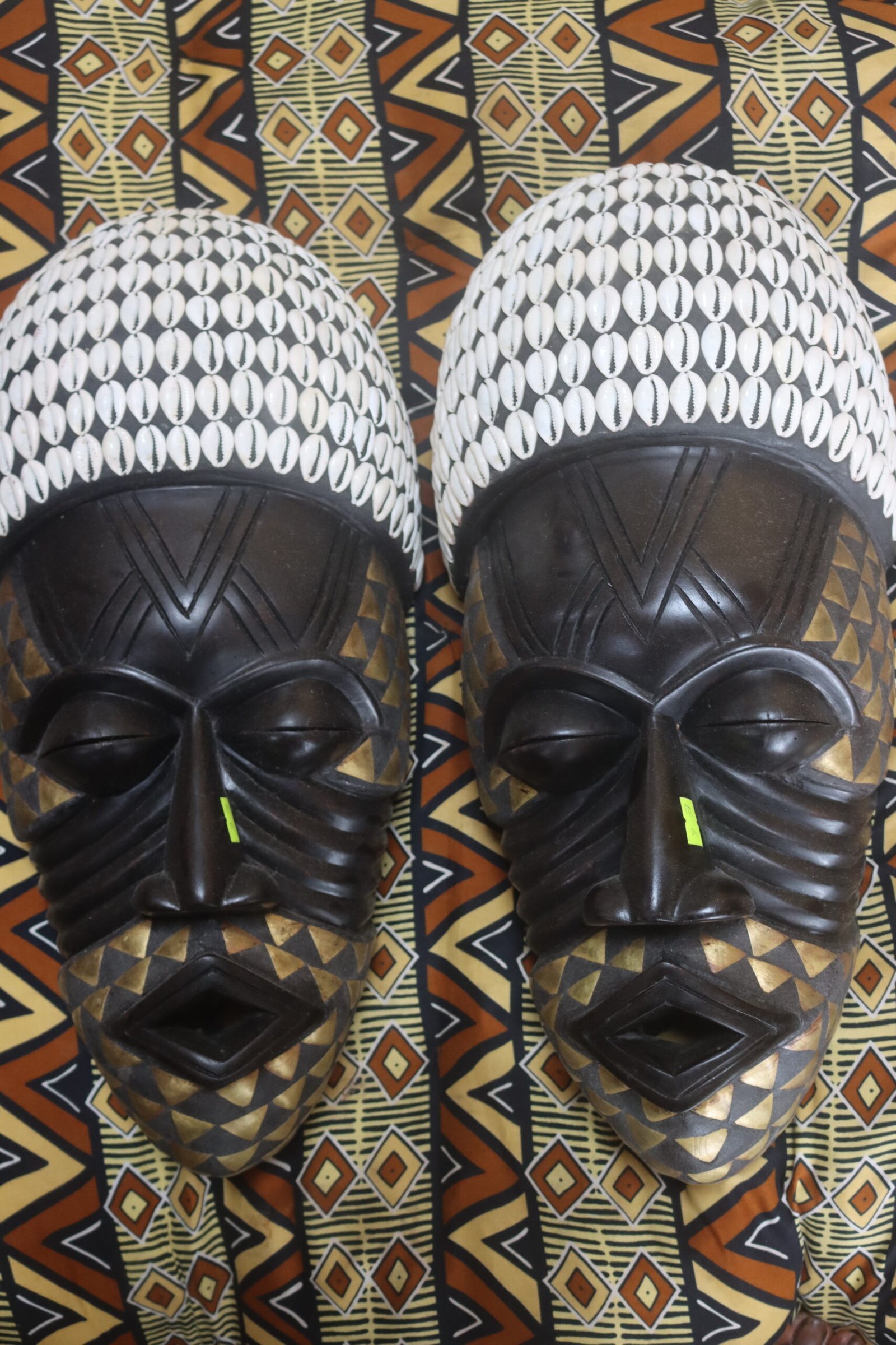 Experience the allure of African artistry with this exquisite pair of hand-carved tribal masks. Each mask is meticulously crafted with stunning patterns and unique designs, showcasing the rich cultural heritage of African tribes. Measuring approximately (insert size) and featuring a blend of vibrant colors and natural tones, these masks are perfect for adding a touch of cultural sophistication to your home decor. Whether displayed on a wall or used as a statement piece in any room, these masks are sure to captivate and inspire